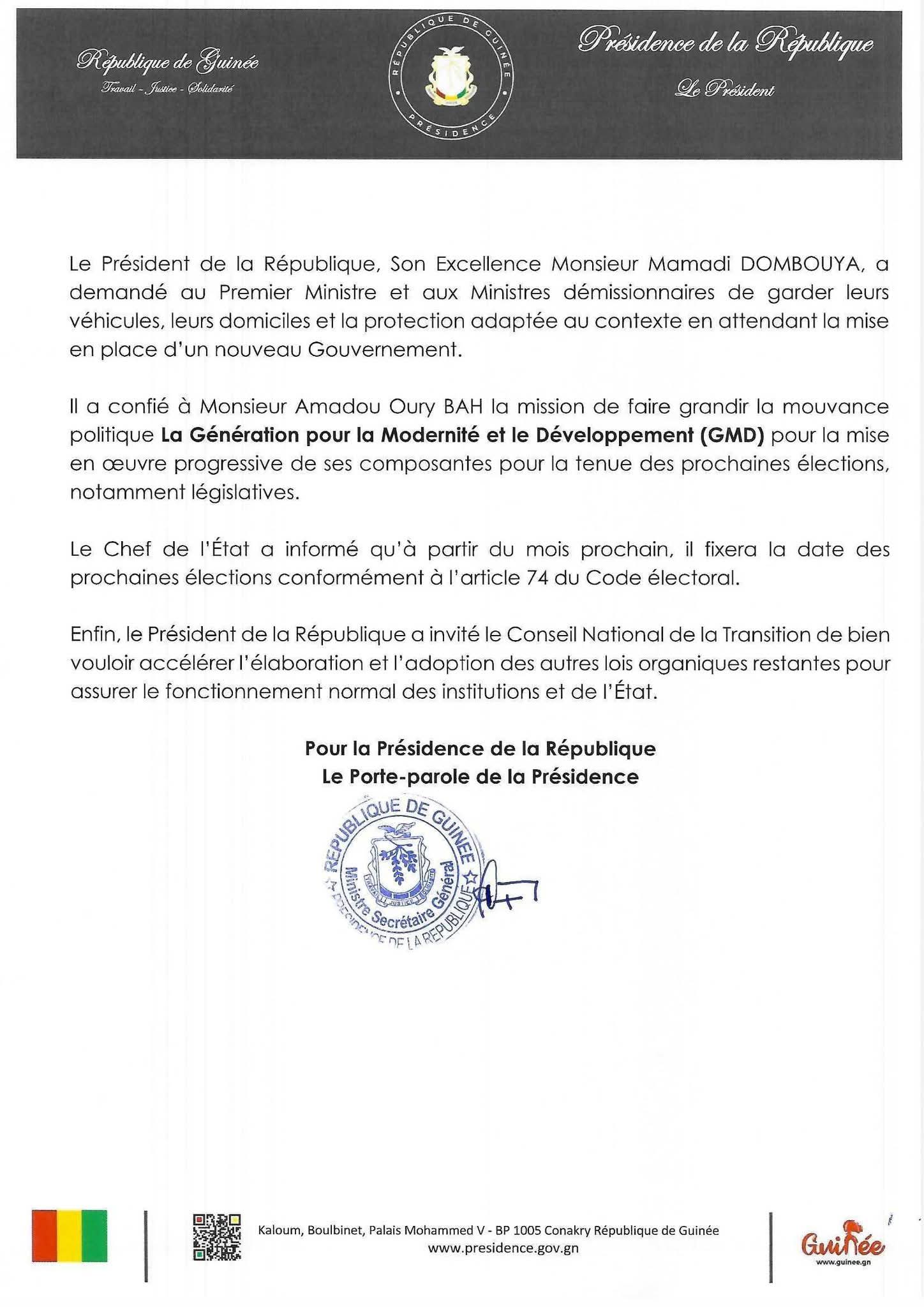 Le président Mamadi Doumbouya a précisé que les ministres et l’ancien Premier ministre conserveront temporairement leurs véhicules, domiciles et protection, afin d’assurer une transition stable et sécurisée jusqu’à la mise en place du nouveau gouvernement.