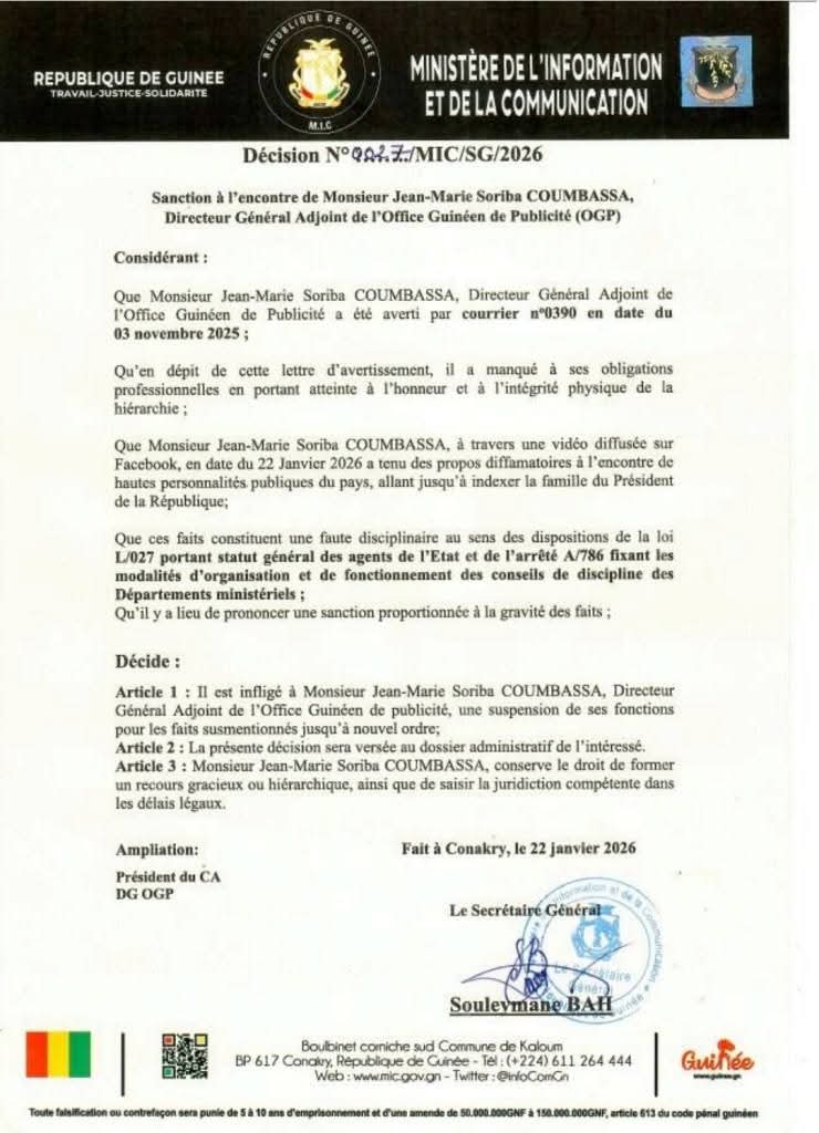 La sanction, enregistrée sous le numéro 2022/7/MIC/SG/2026 et signée par le Secrétaire Général du MIC, Souleymane Bah, intervient après un avertissement formel adressé à M. Coumbassa en novembre 2025. Le ministère lui reproche « un manquement à ses obligations professionnelles en portant atteinte à l’honneur et à l’intégrité de la hiérarchie ».