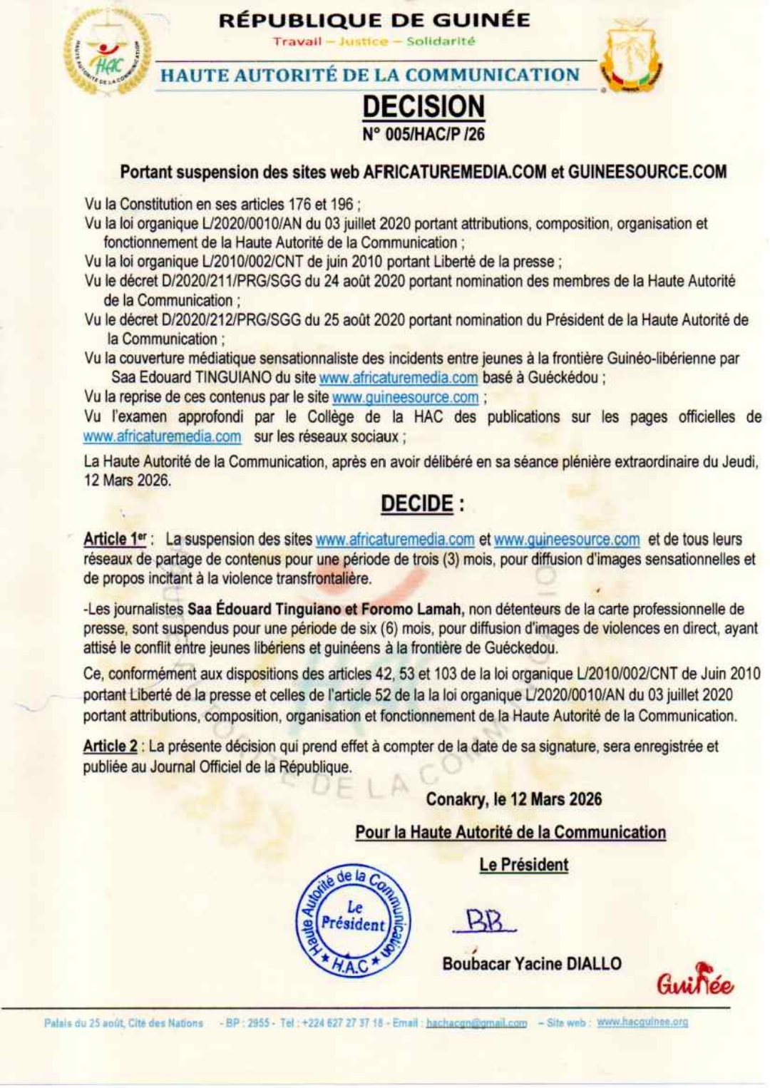 La HAC précise également la suspension pour six mois des journalistes Saa Édouard Tinguiano et Foromo Lamah, impliqués dans la diffusion de ces contenus, et souligne qu’ils ne possèdent pas de carte professionnelle de presse.